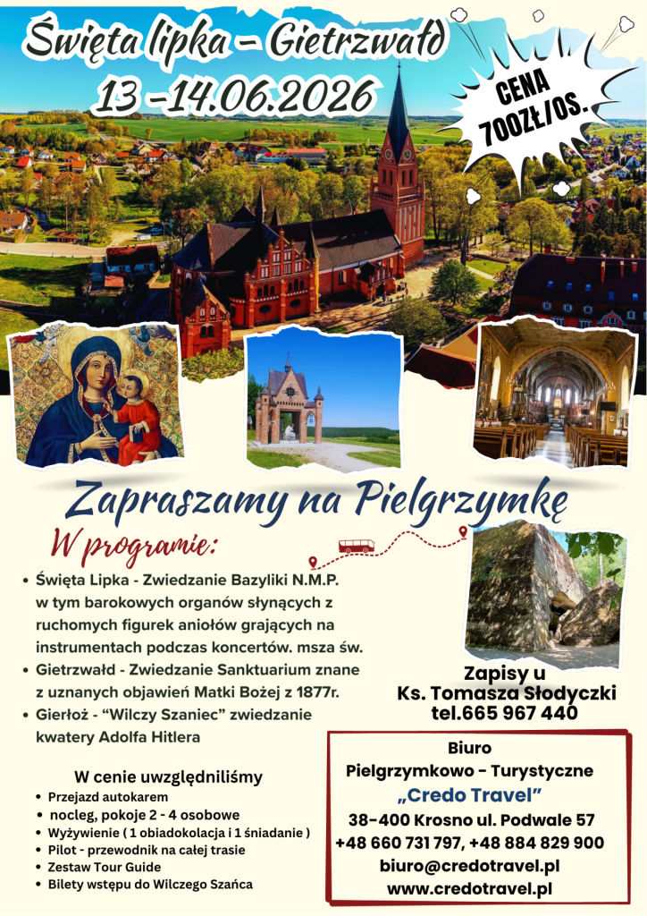 Parafia w Korczynie zaprasza na Pielgrzymkę Parafialną do Gietrzwałdu i Świętej Lipki, która odbędzie się w dniach 13 – 14 czerwca. Koszt wyjazdu wraz z noclegiem i wyżywieniem to 700 złotych. Zapisy w zakrystii lub w Biurze Pielgrzymkowo – turystycznym „Credo Travel”. Przy zapisie należy podać numer telefonu do kontaktu i wpłacić zaliczkę w wysokości 200 złotych. Szczegóły na plakacie
